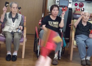 ご利用者様は椅子に座って、歌を歌いながら、手や足を動かしたり、鳴子を使ったり、
